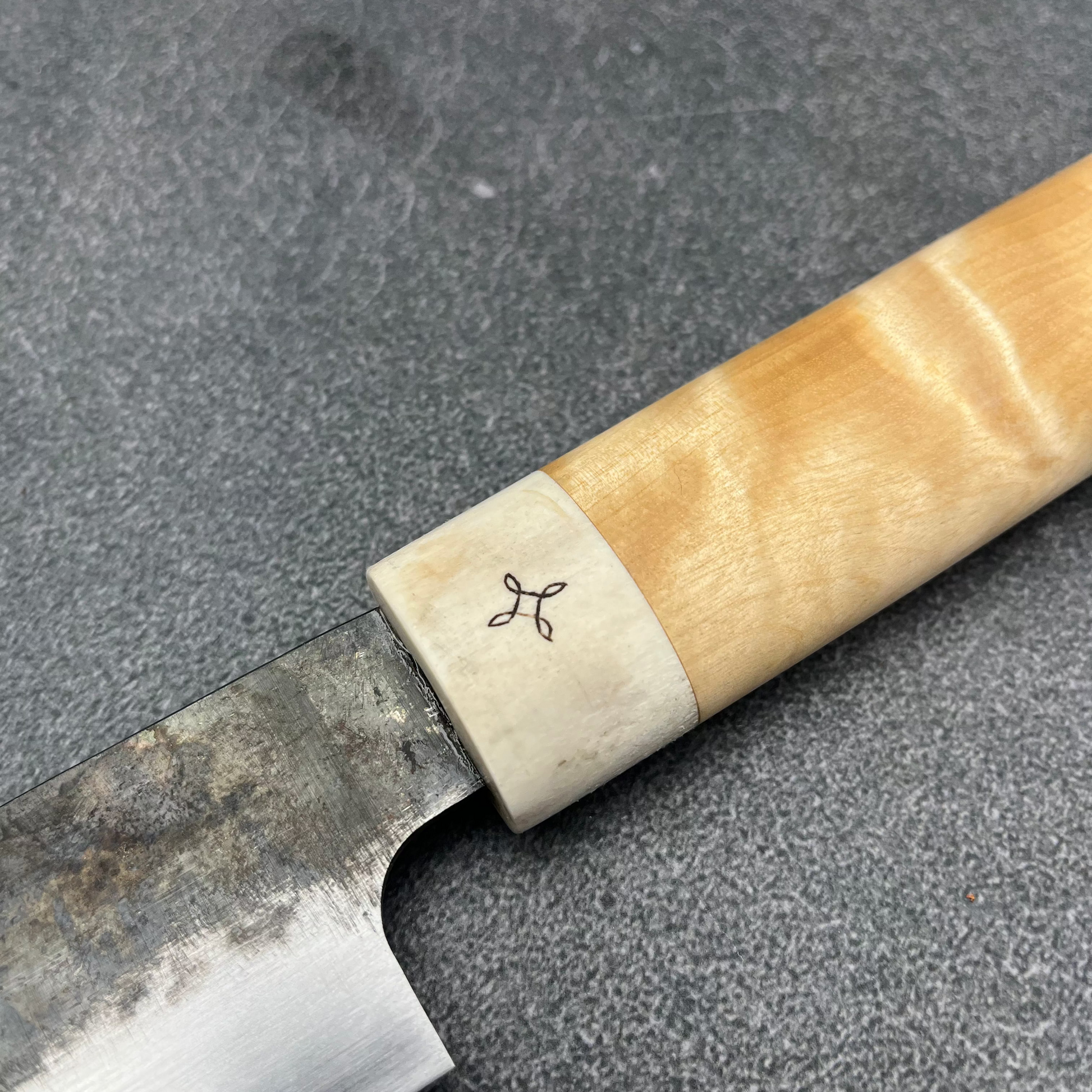 Veitsen kahva on valmistettu koivun pahkasta ja poron sarvesta, materiaaleista jotka henkivät pohjoisen luontoa ja kestävyyttä. Sarviosaan kaiverrettu stikkelikaiverrus tuo mukaan pohjoismaista mystiikkaa ja perinteiden kunnioitusta – yksityiskohta, joka tekee veitsestä paitsi käyttöesineen myös taideteoksen. Kahva istuu käteen luonnollisesti ja tarjoaa varman otteen pitkissäkin työskentelyjaksoissa.